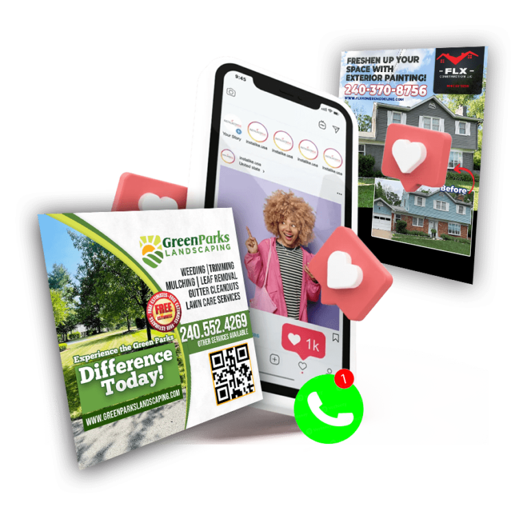 Product photos with branded graphics. Service promotions. Quote cards. Before/after showcases. Whatever fits your business.
